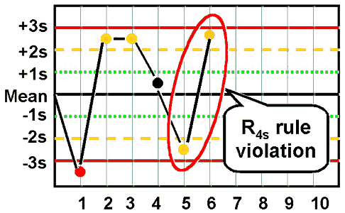 R4s - Is there a pattern where the range of results is too wide, one result exceeding the mean + 2s and another result exceeding the mean -2s control limit? If so, the random error of the method is larger than expected (a precision problem).