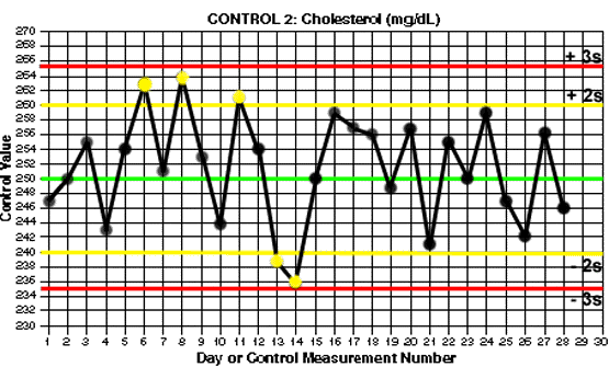 - Day 11. Both control values exceed 2s control limits, but one is positive and one is negative. It is a rare occurrence and most likely there is a problem with the method. Since the two controls are out in opposite directions, it is likely that there is a random error (or problem with the precision of the method). Note that this interpretation applies the R4s rule, i.e., the range of the control values exceeds 4s. Stop, reject the run, trouble- shoot the method, fix the cause of the problem, then restart the method and reanalyze the patient specimens.